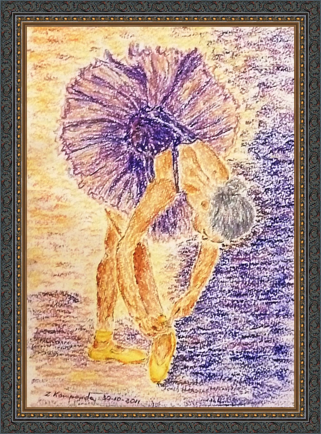 A dancer in golden ballerinas